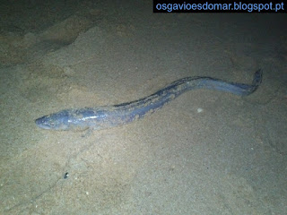 Mas infelizmente não foi bem assim... As minhas canas já estavam a trabalhar e começaram a sair umas bailas, daquelas muita boas... Depois lá veio um sargo palmeiro... E depois vieram dois peixes muito esquisitos...Na primeira vez, estava a puxar a linha e a pensar (epá este parece bonzinho), mas vinha com um toque estranho... Porque será??? Ora aqui está a explicação: